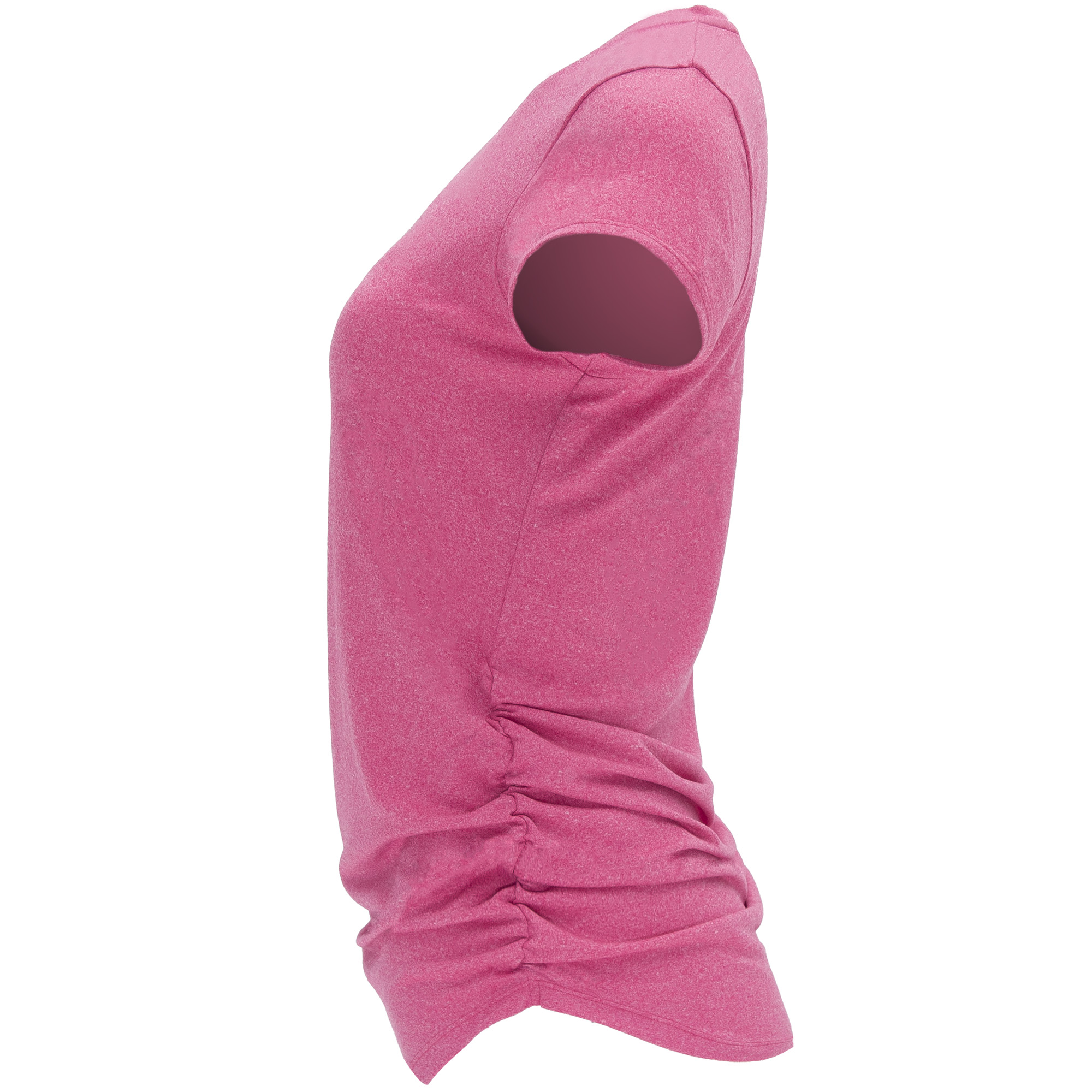 Camiseta técnica multi-deporte de manga corta para mujer. Tejido poliéster tacto algodón. Cuello redondo del mismo tejido. Laterales elásticos fruncidos para mejor adaptación al cuerpo. Corte entallado y largo especial.