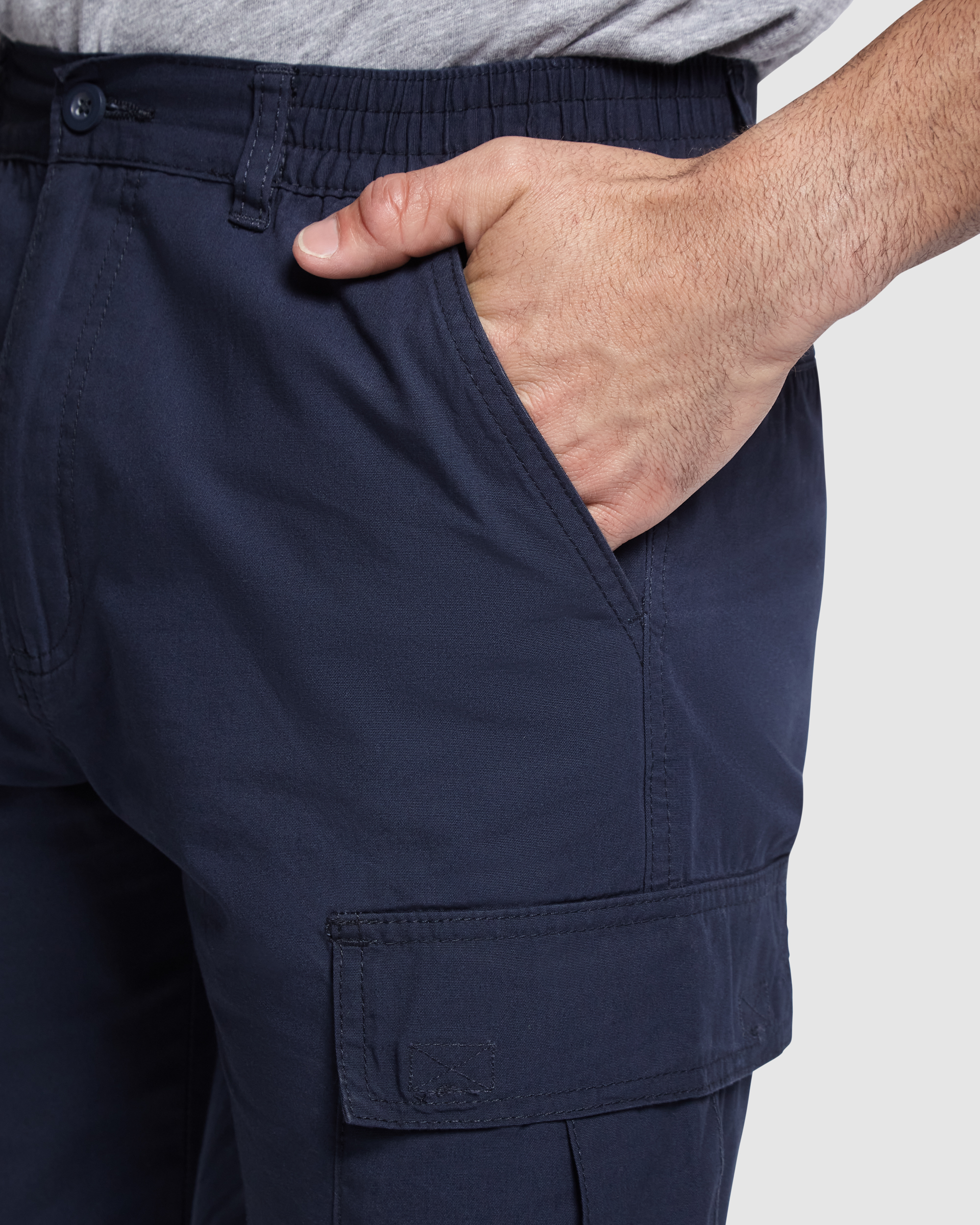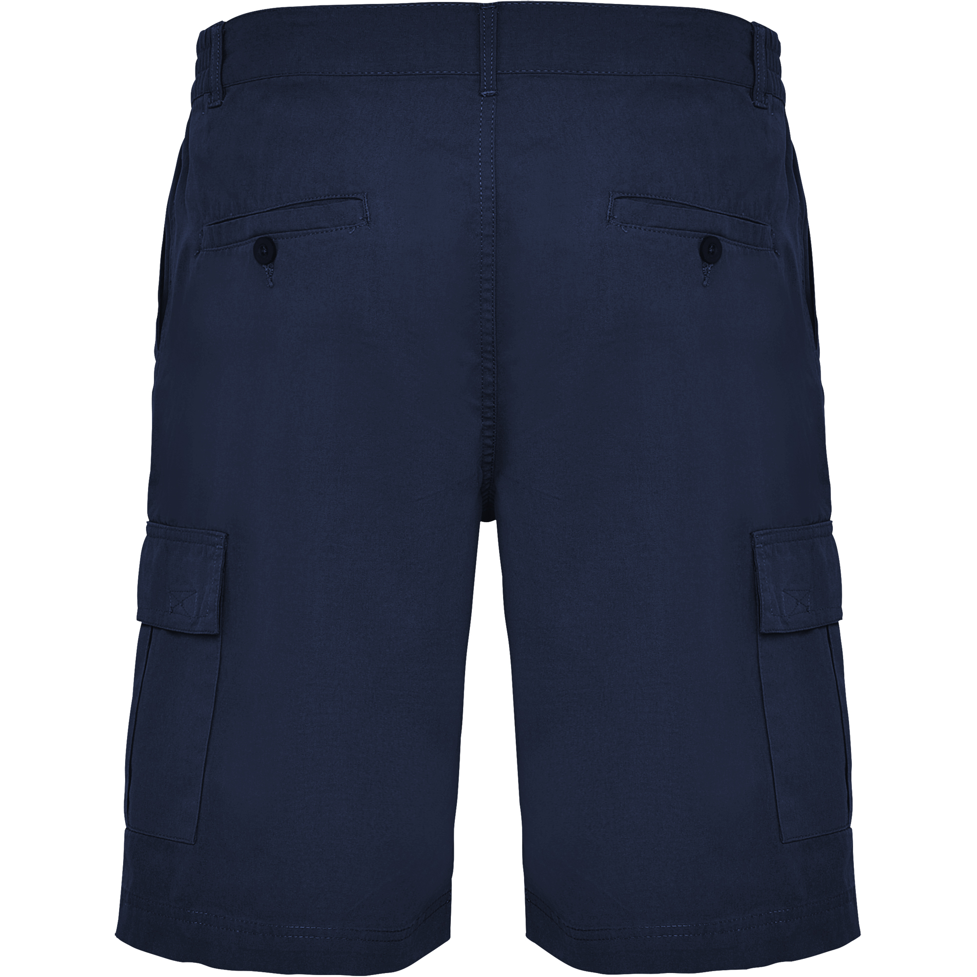 Pantalón corto con bolsillos. · Cintura elástica ajustable en laterales. · Dos bolsillos frontales. · Dos bolsillos laterales con tapeta, cierre velcro y fuelle central. · Dos bolsillos traseros de ojal con botón.