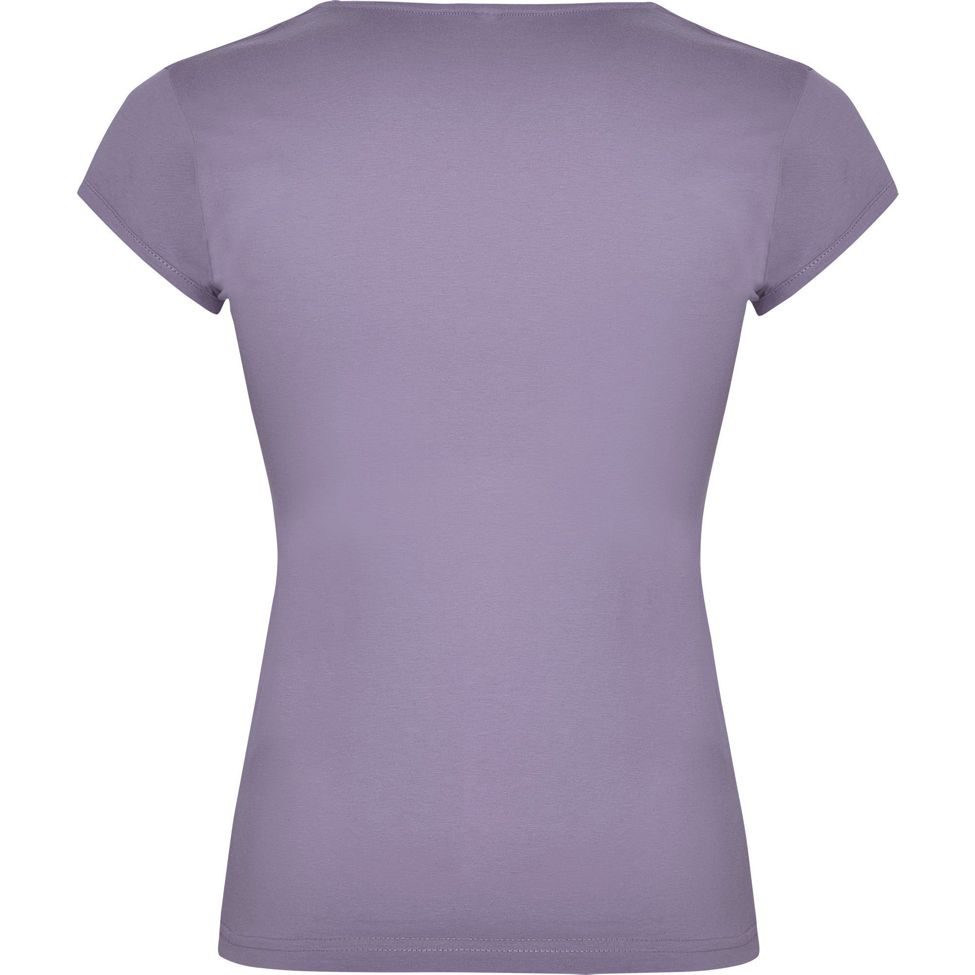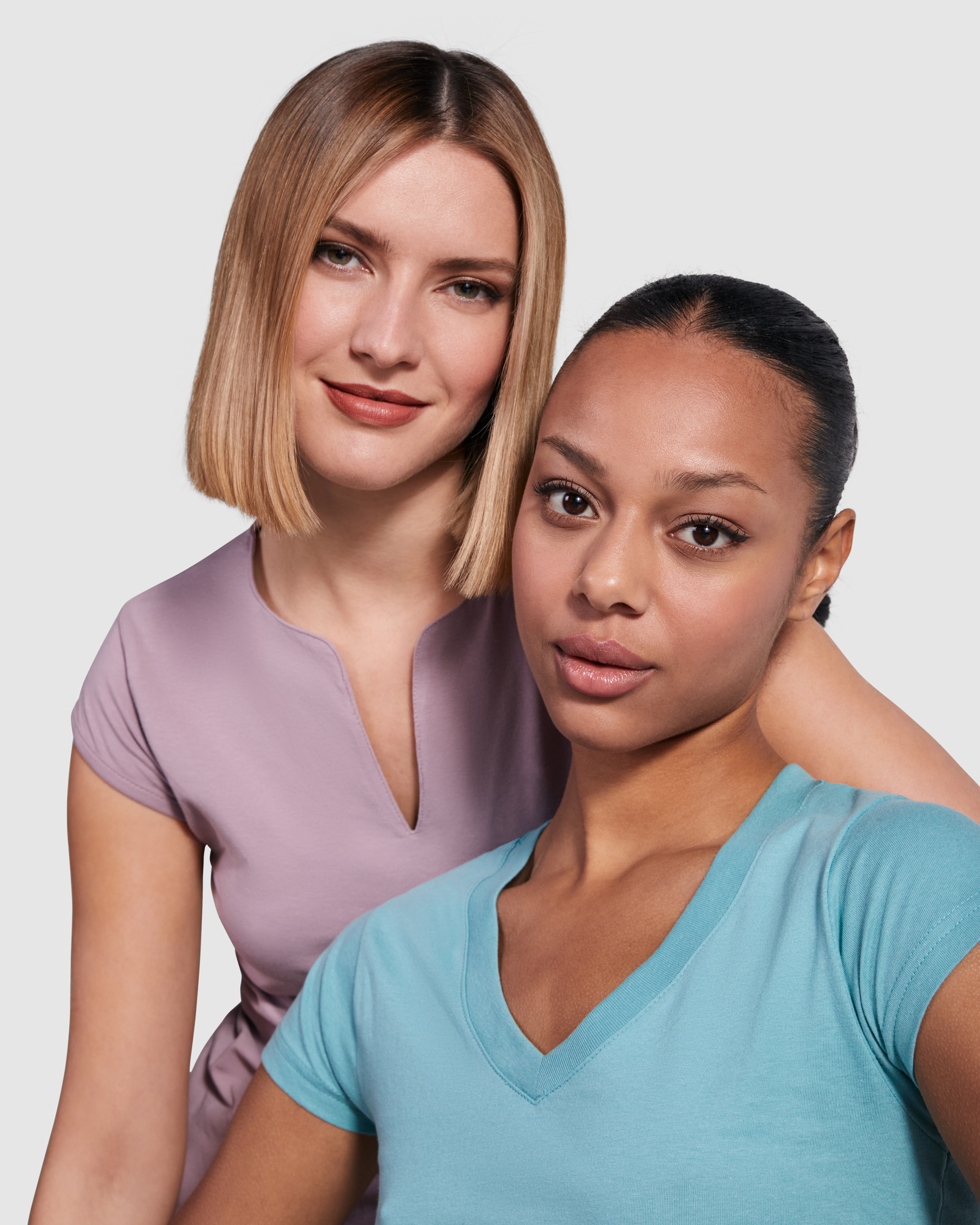 Camiseta entallada de cuello redondo con abertura en V, semi-manga al hombro ribeteada y costuras laterales.