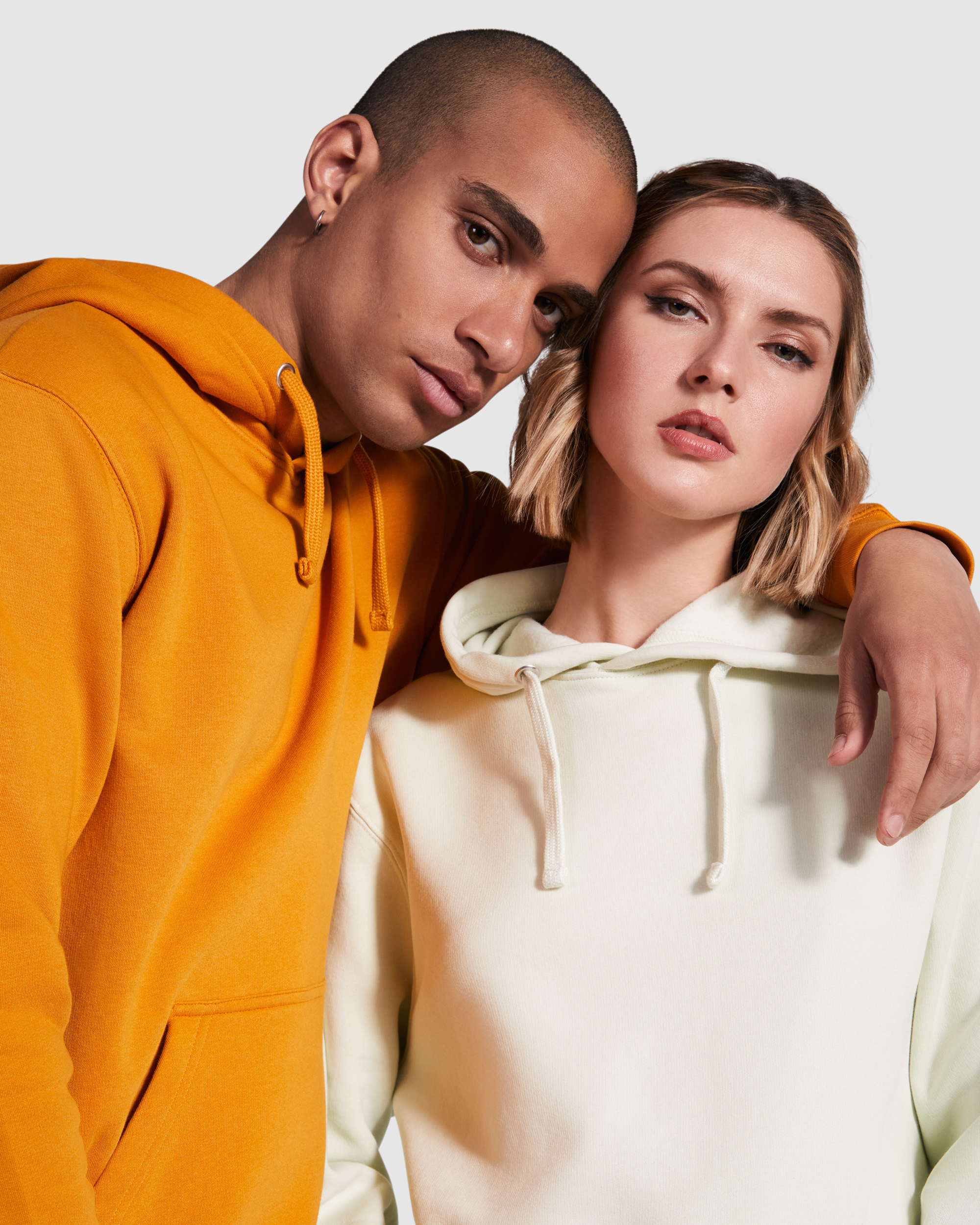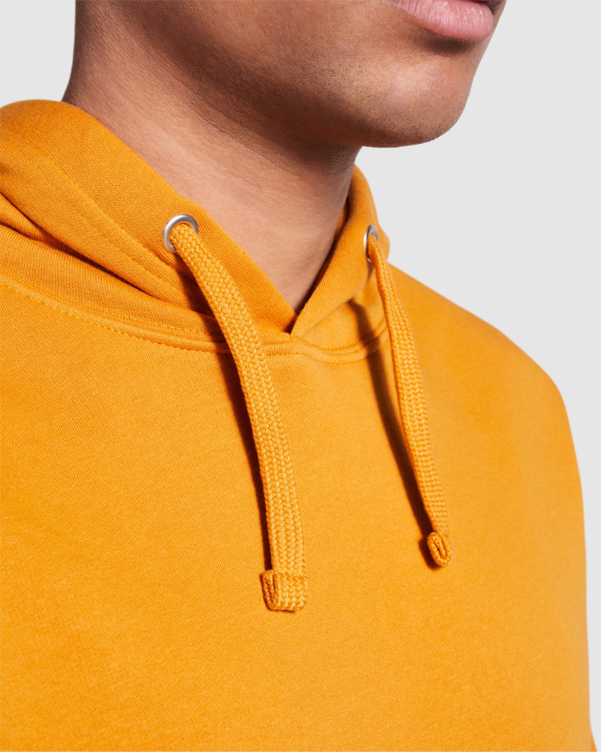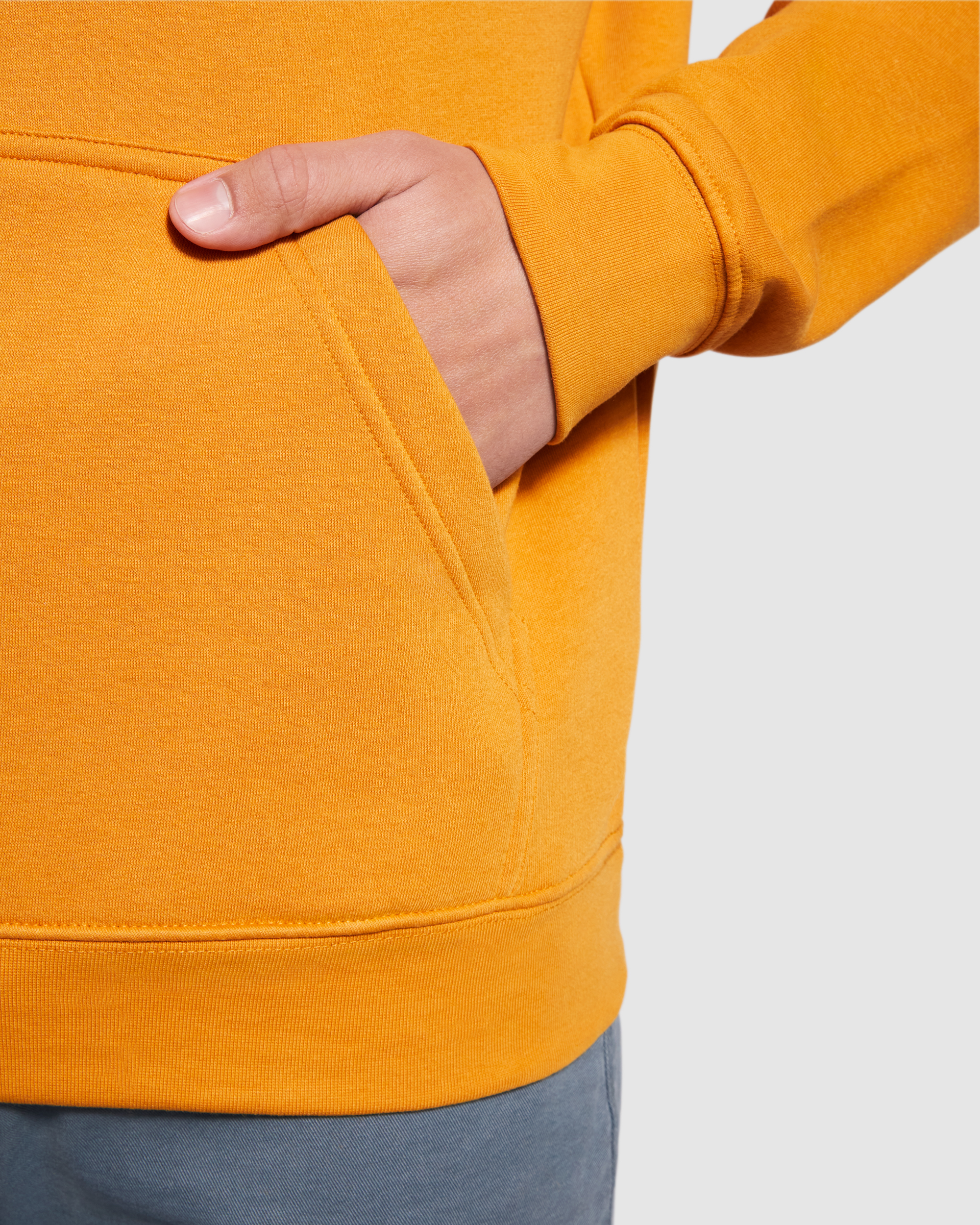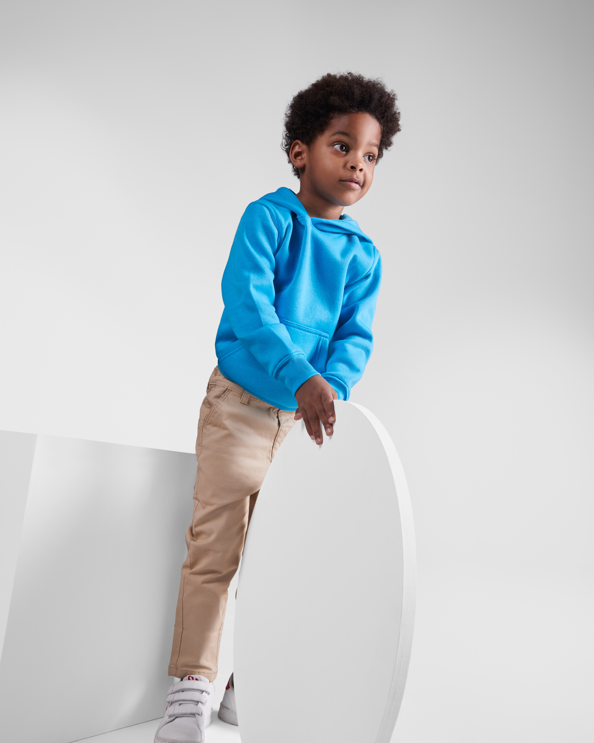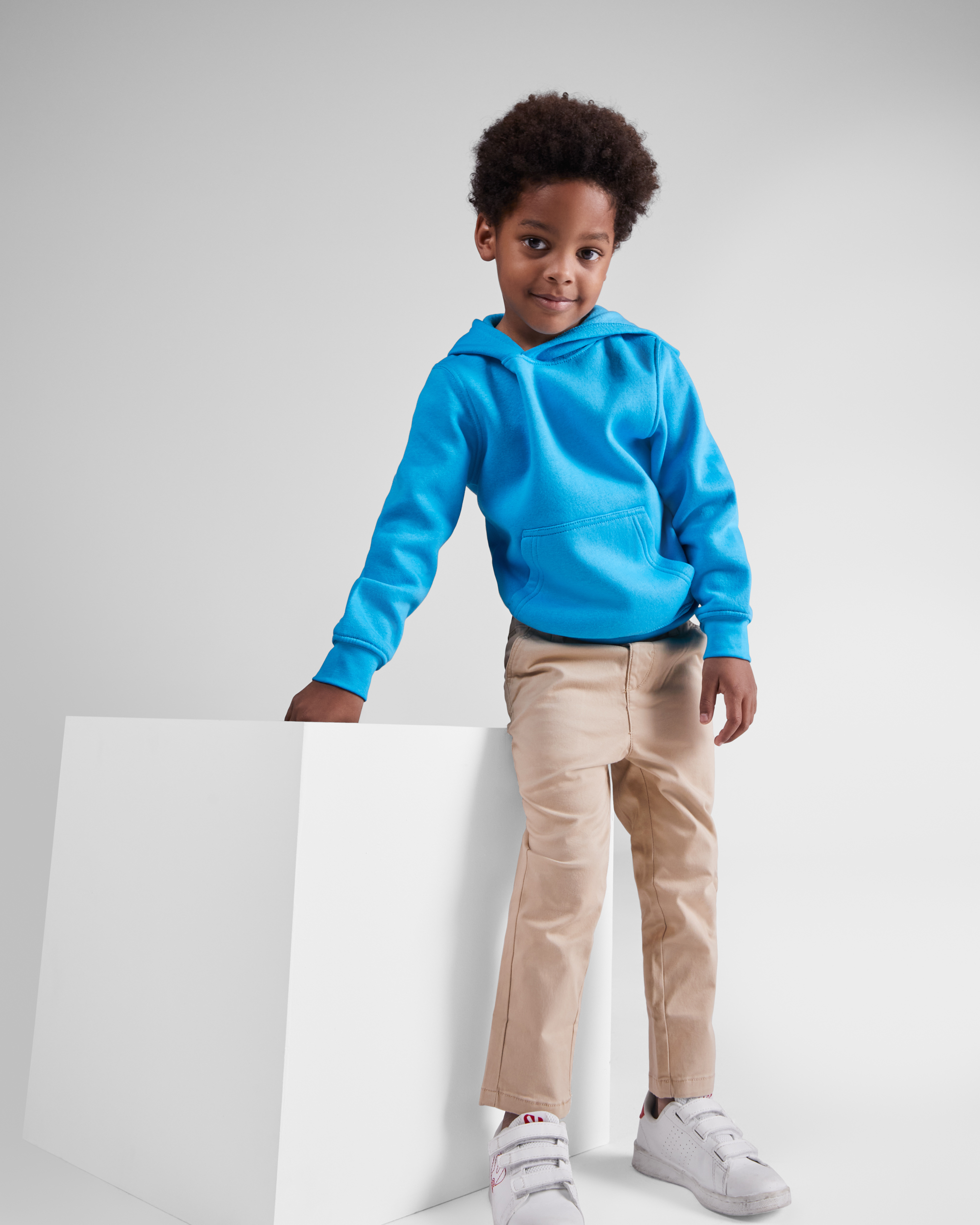 Sudadera capucha con bolsillo canguro y cordón plano ajustable. Puños y cinturilla con punto canalé 1×1 con elastano. Modelo de niño sin cordón.