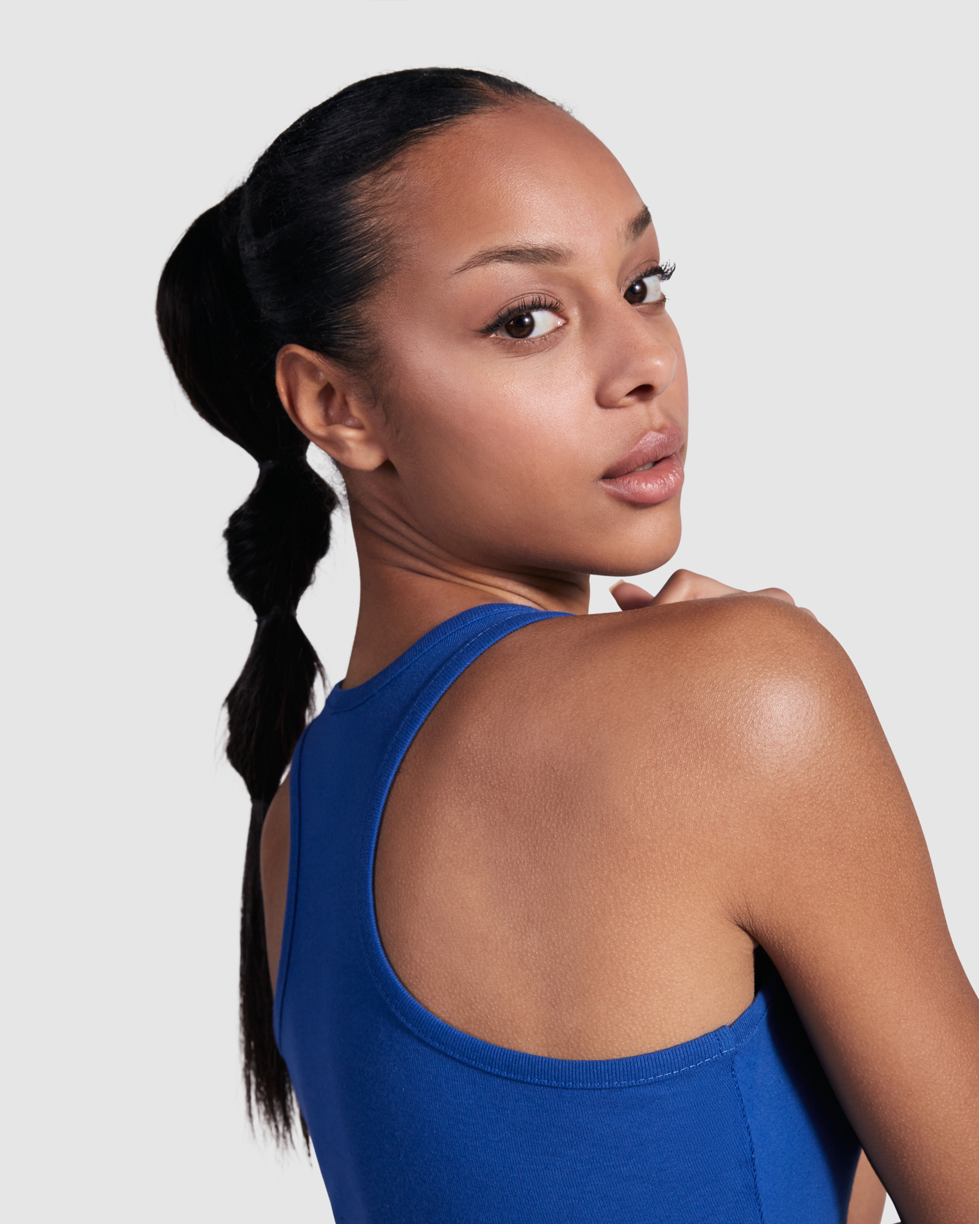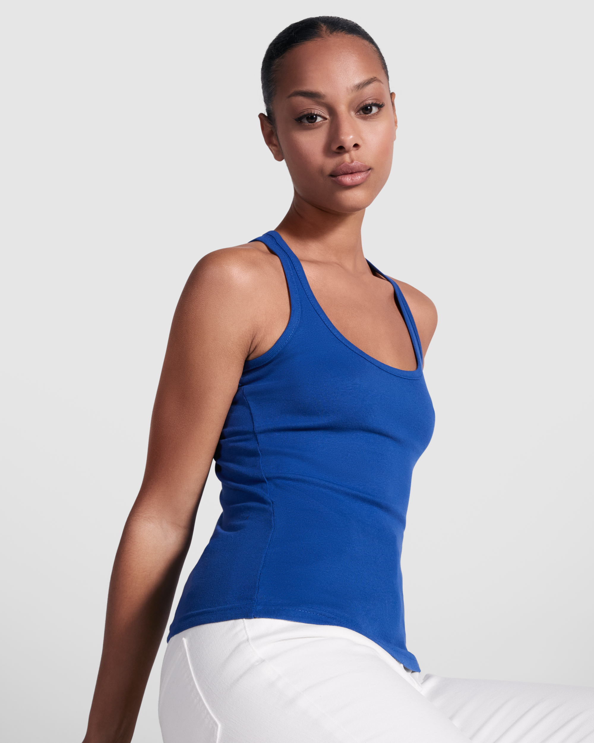 Camiseta entallada, con sisas y escote ribeteado, ancho y enrollado. Espalda estilo nadadora y costuras laterales.