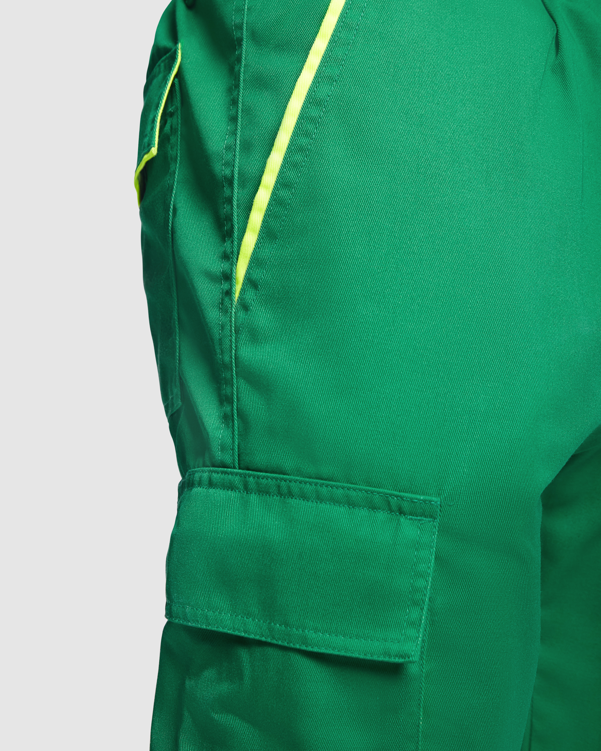 Pantalón largo multibolsillos forrado de alta visibilidad. · Forro interior en tejido polar. · Detalles flúor a contraste en bolsillos. · Cintura ajustable elástica en la parte trasera. · Dos bolsillos frontales. · Dos bolsillos traseros con tapeta y cierre de velcro. · Dos bolsillos laterales de fuelle con tapeta y cierre de velcro. · Combinado en dos colores y cintas reflectantes horizontales.