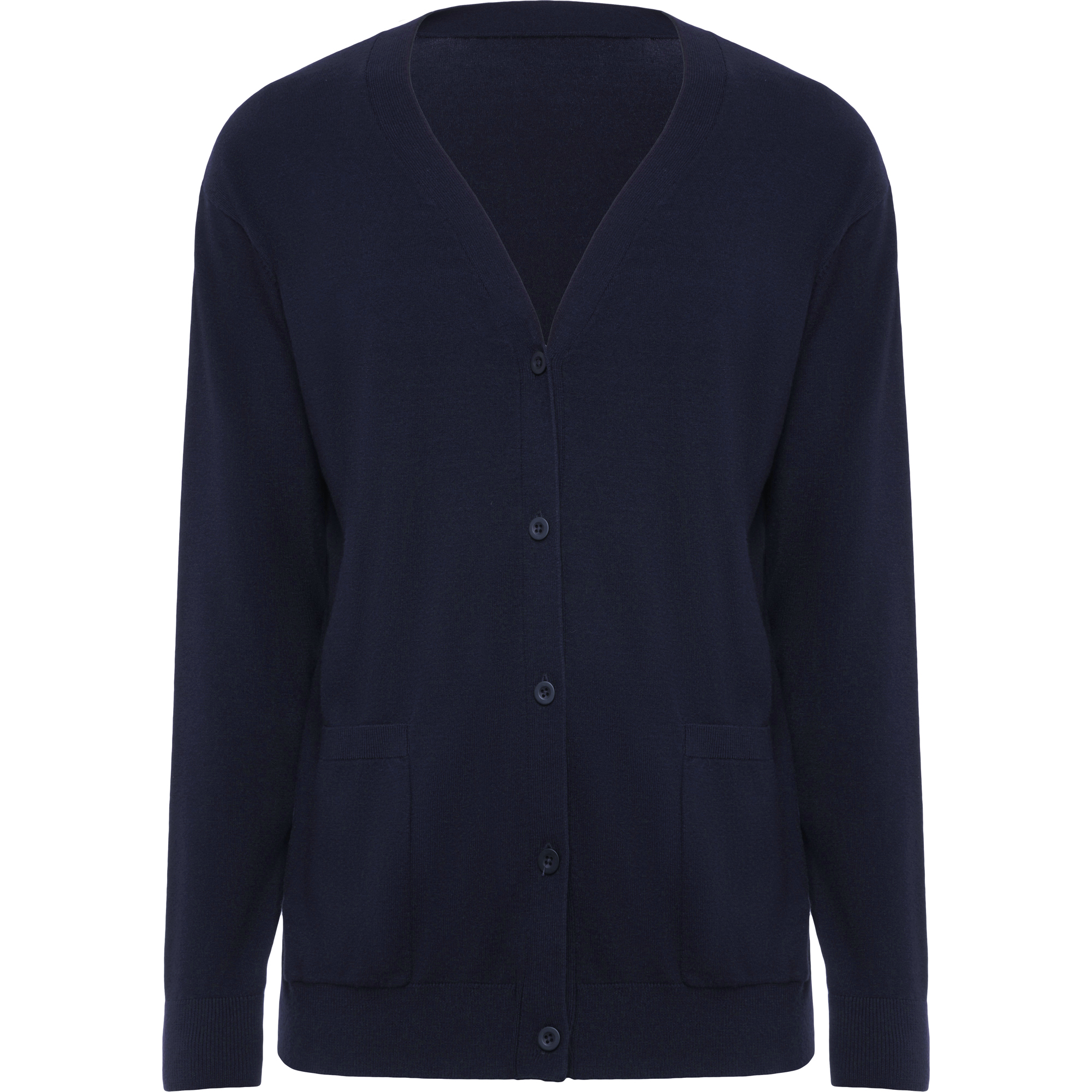 Chaqueta con escote de pico para mujer. · Tejido en punto suave. · Cierre central de cinco botones al tono. · Dos bolsillos de plastón. · Puños y cintura elásticos en punto canalé.