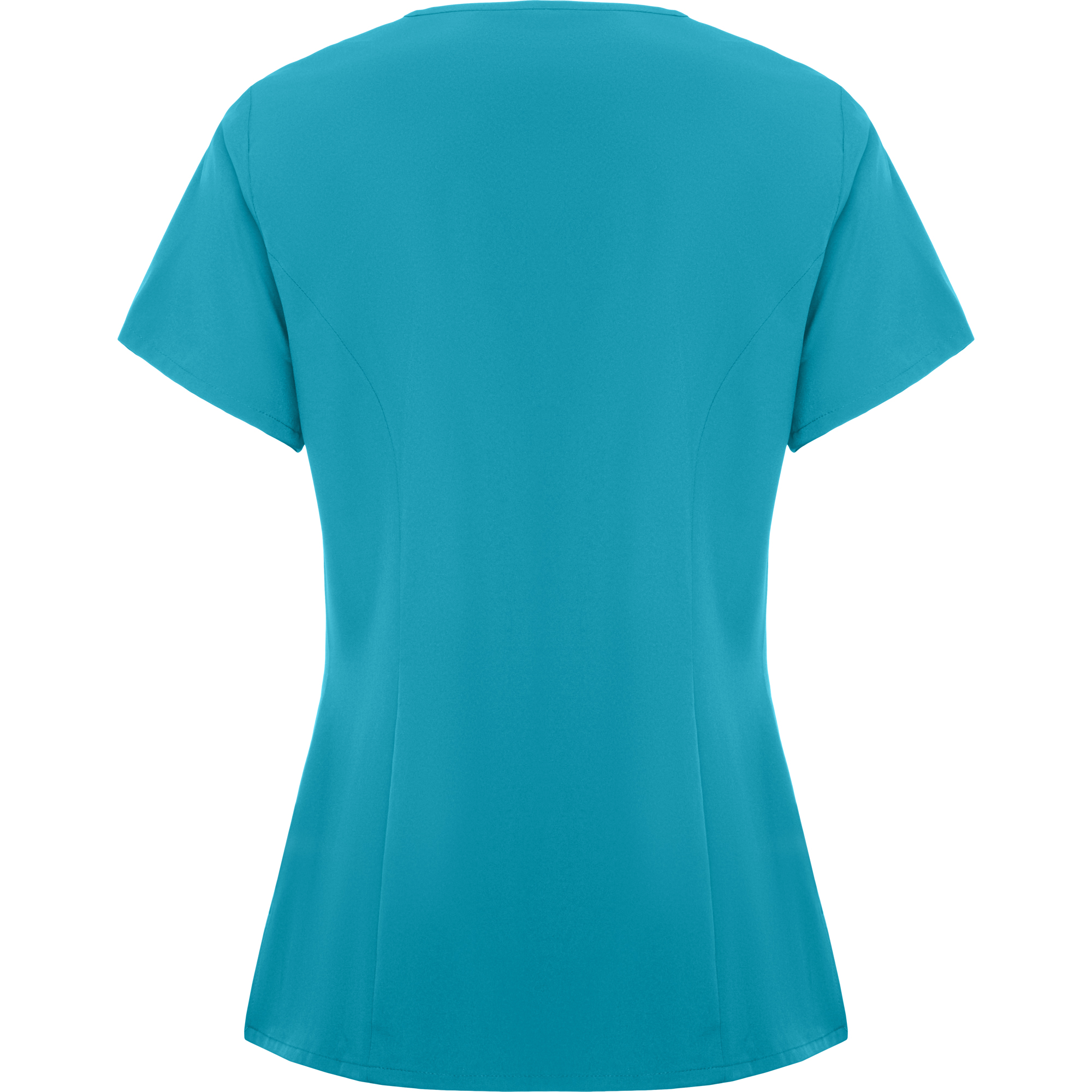 Casaca de servicios de manga corta de mujer. · Escote de pico cruzado. · Dos bolsillos franceses. · Aperturas laterales.