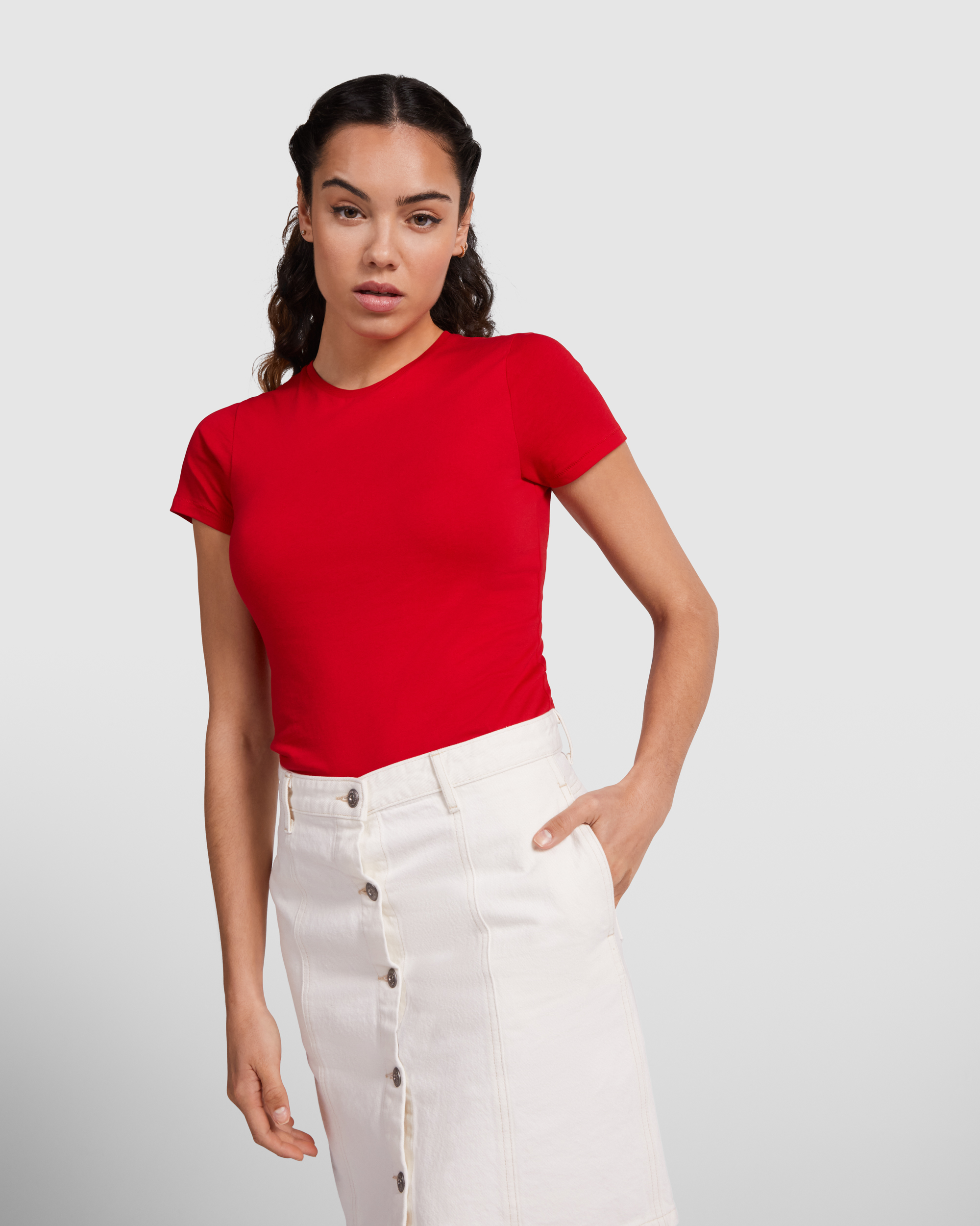 Camiseta entallada de manga corta en Algodón Orgánico. Cuello redondo con Rib 1×1. Costuras decorativas en bajo y mangas. Costuras laterales.
