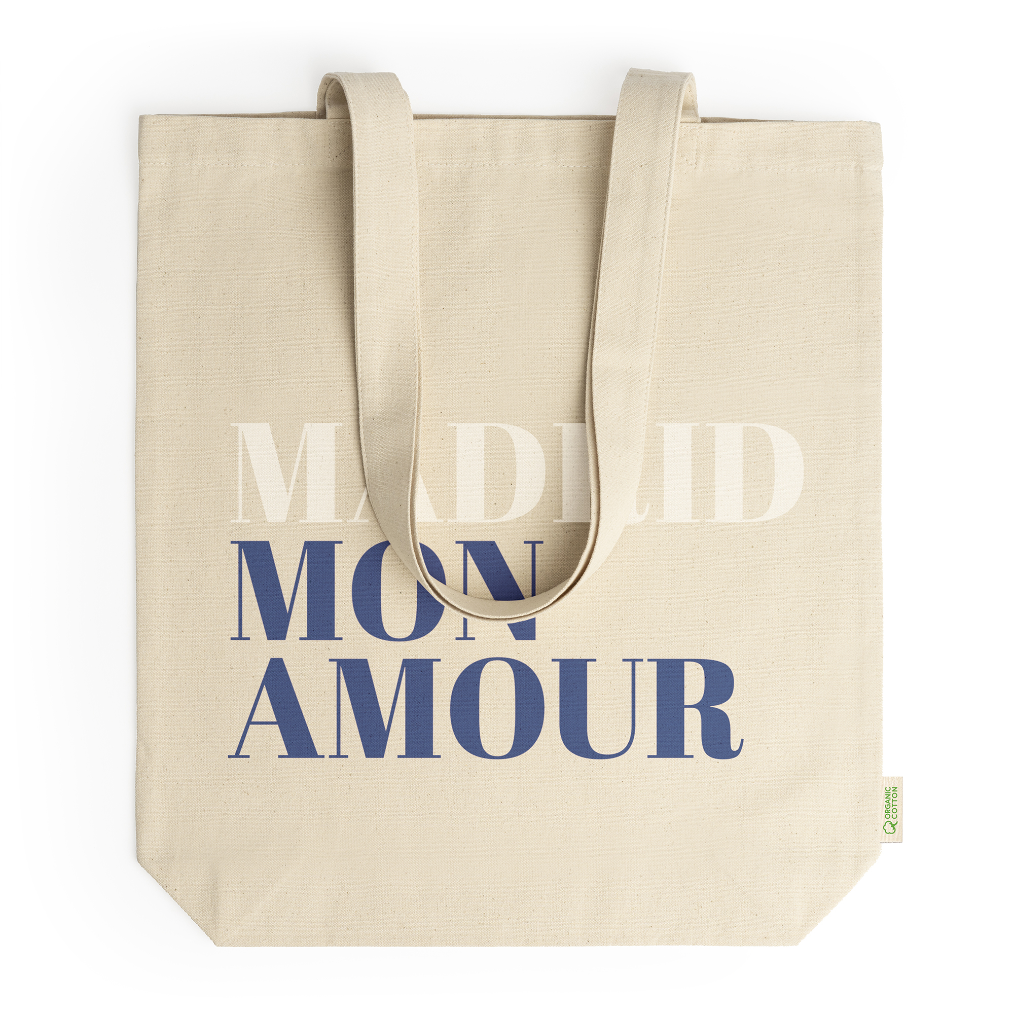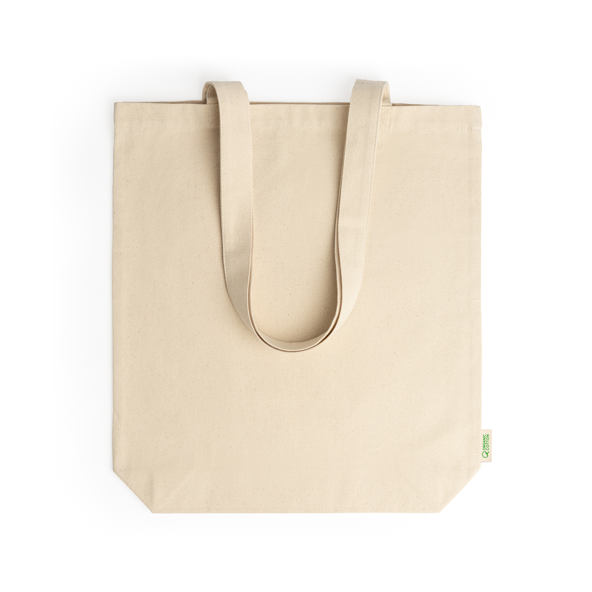 Bolsa 100% algodón orgánico de 280 g/m² con fuelle y prácticas asas largas de 70cm.