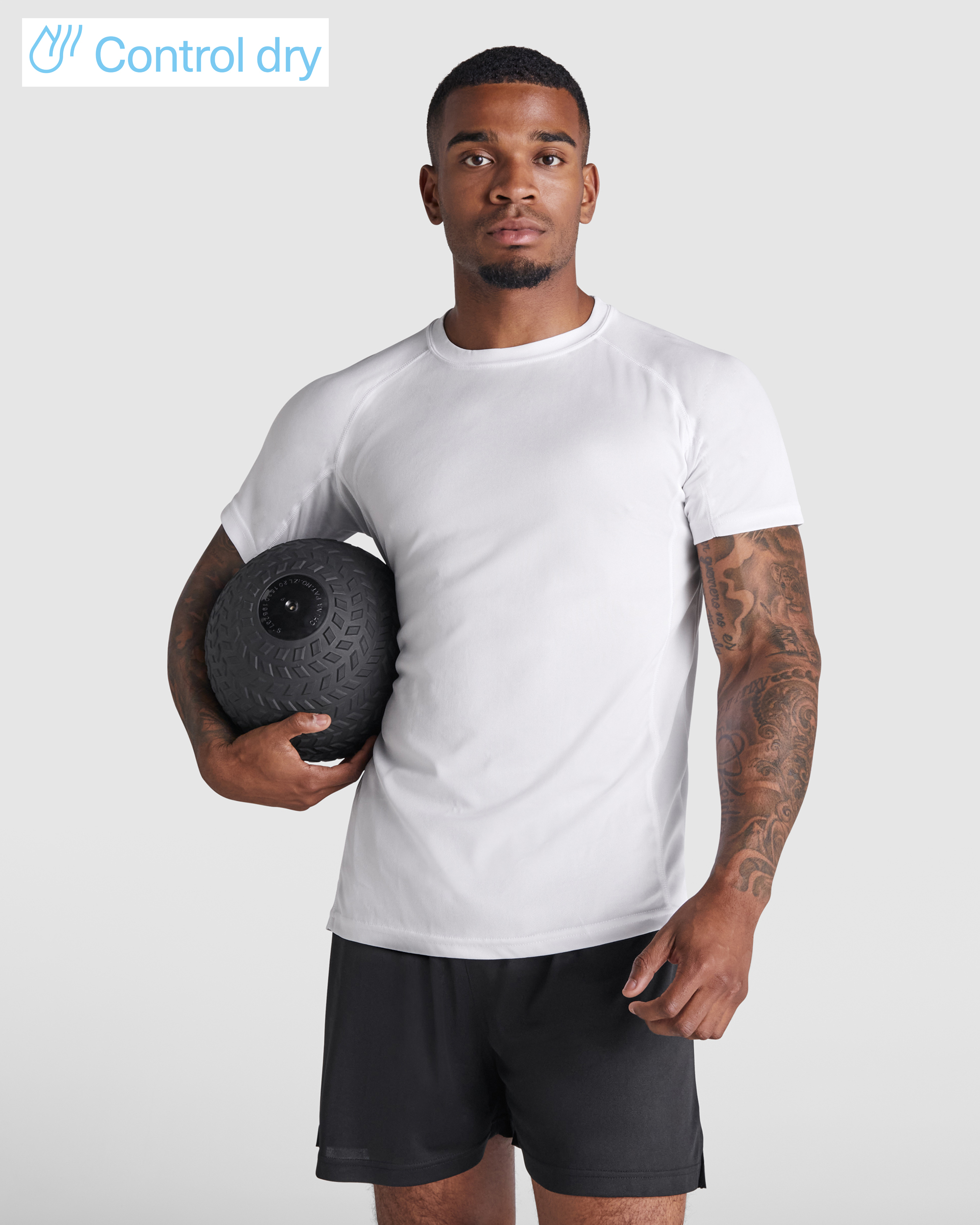 Camiseta técnica de manga corta ranglán. Escote redondeado con cubrecosturas. Cortes laterales con remallado al tono.