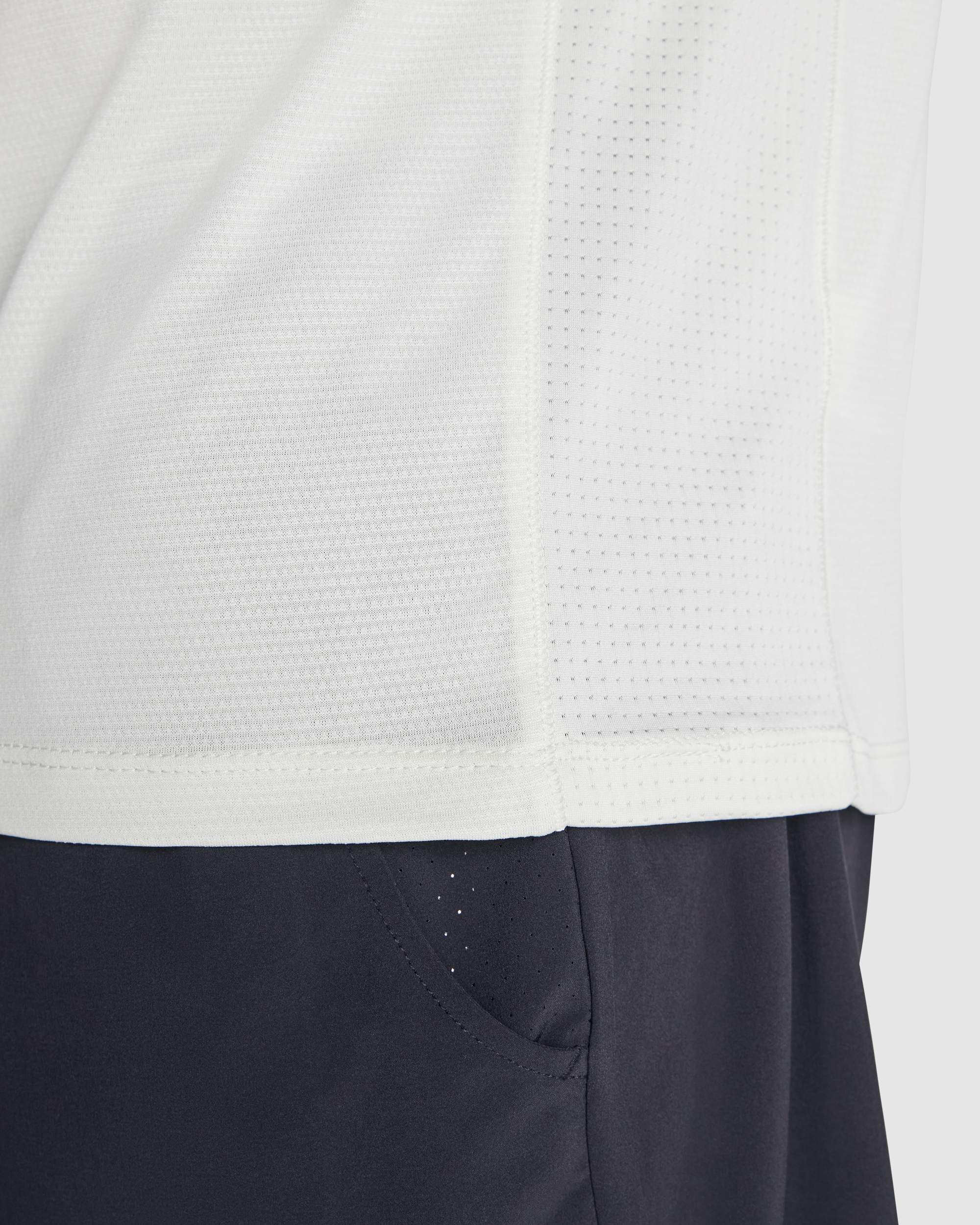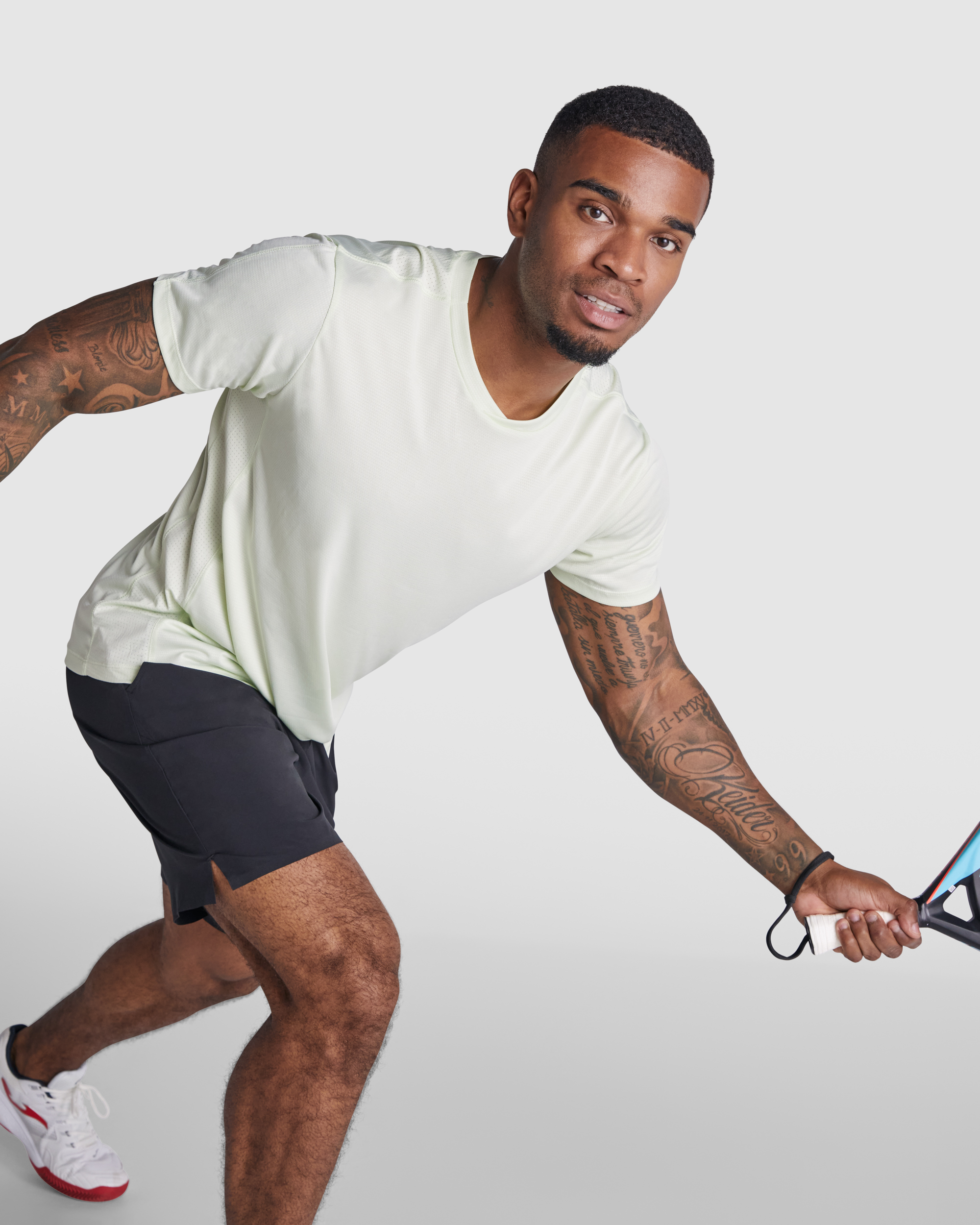 Camiseta técnica de manga corta para hombre. Tejido ligero realizado en poliéster reciclado. Cuello con detalle cruzado y cubrecosturas. Canesú en espalda y piezas en mangas en tejido transpirable. Costuras adelantadas e inclinadas en laterales y hombros. Combinada en tejidos transpirables y elásticos.