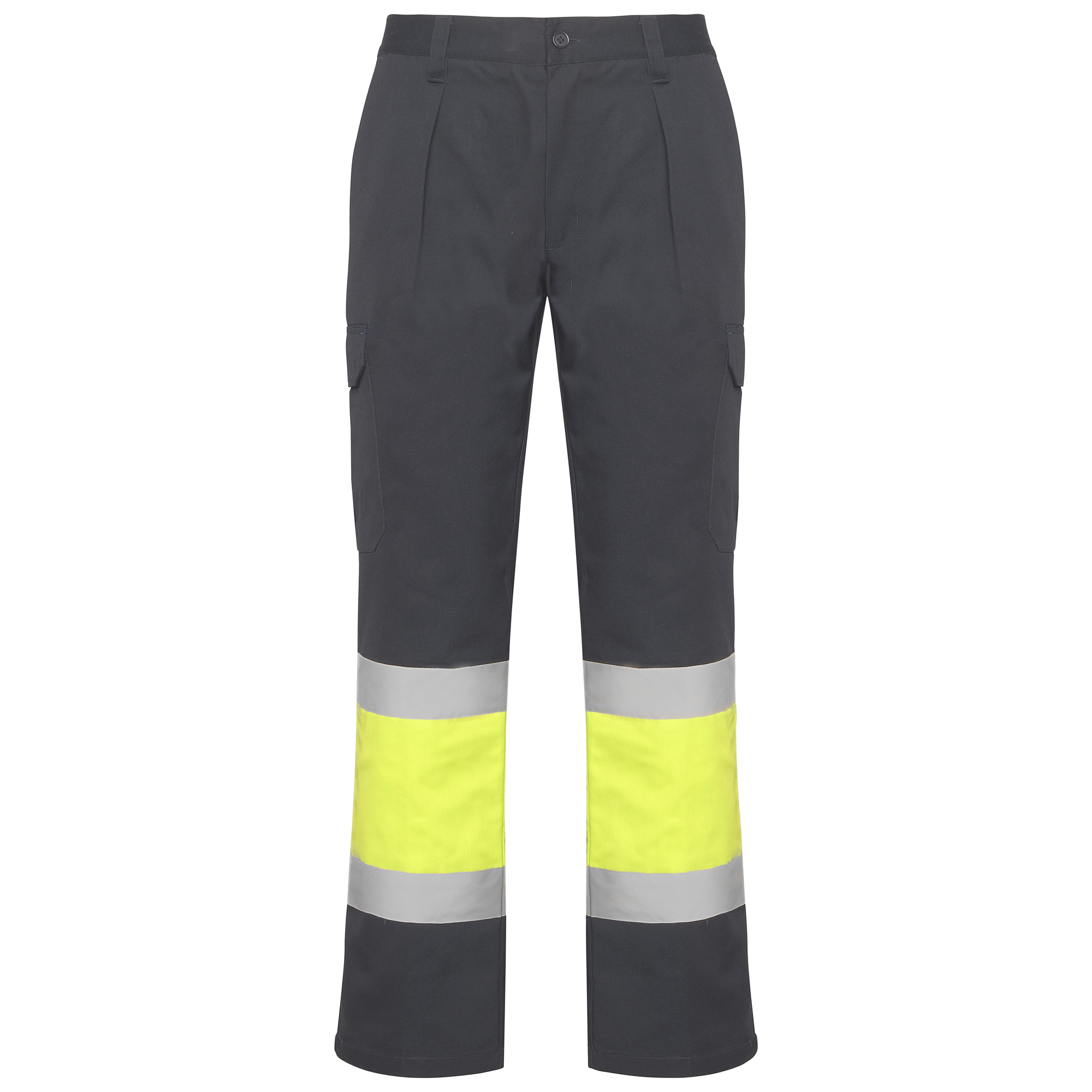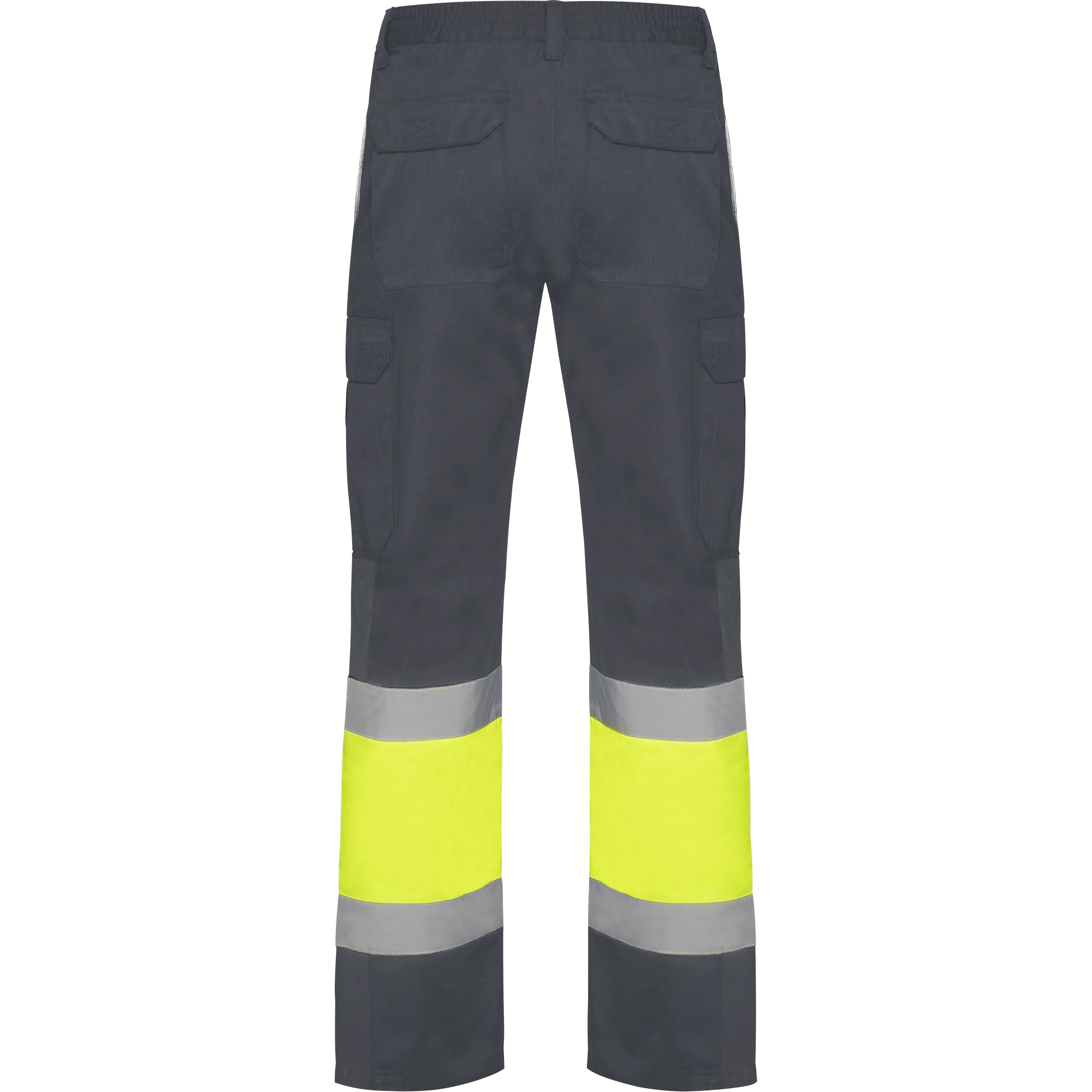 Pantalón multibolsillos de invierno de alta visibilidad. · Cinturilla elástica en la parte trasera. · Dos bolsillos con tapeta en la parte trasera y con cierre de velcro. · Dos bolsillos en el frontal y dos bolsillos laterales con fuelle y tapeta con cierre de velcro. · Combinado en dos colores y con cintas reflectantes horizontales.