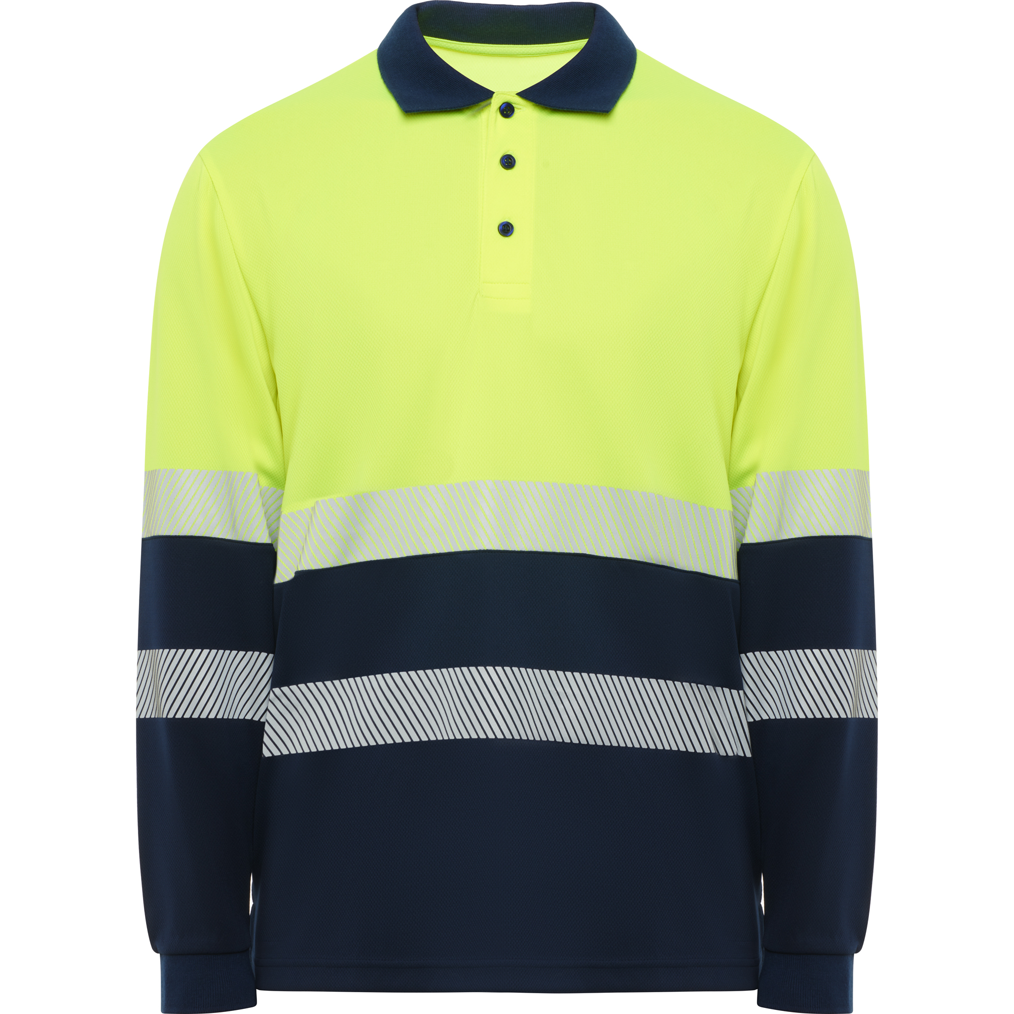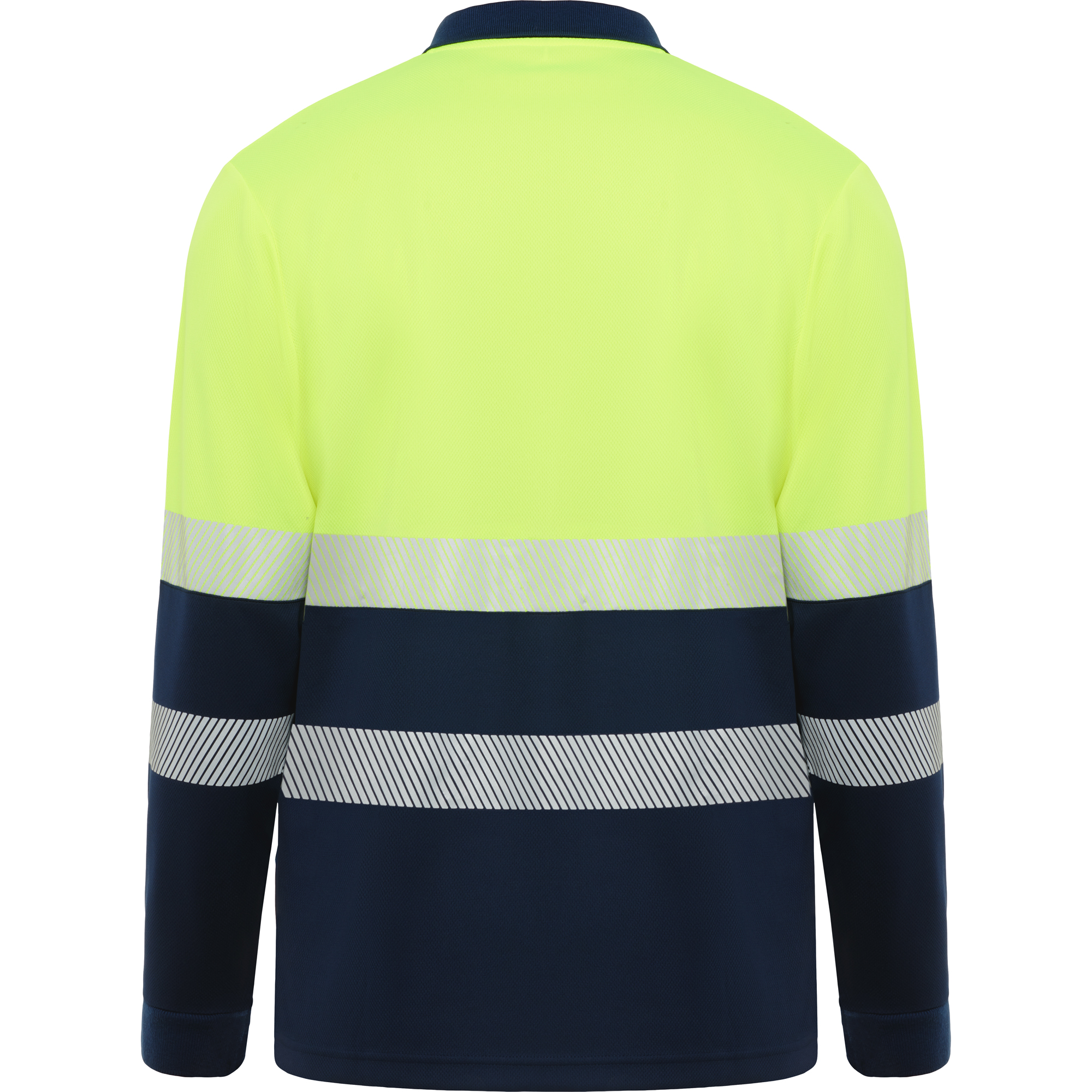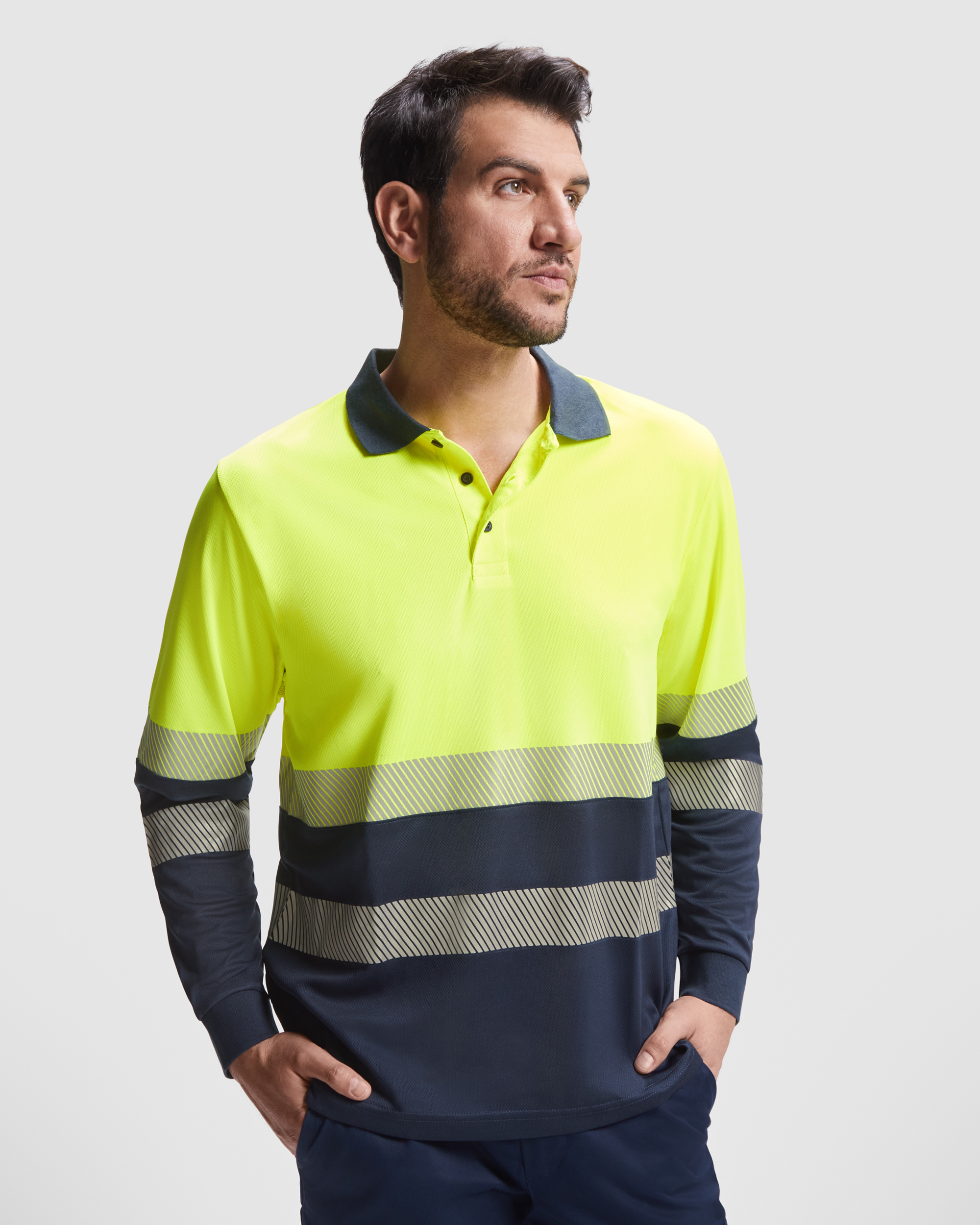 Polo técnico de alta visibilidad en manga larga. · Cuello y puño en punto canalé 1×1. · Dos cintas reflectantes segmentadas en torso y manga. · Tapeta con 3 botones a contraste. · Tejido anti enganches y fácil secado.