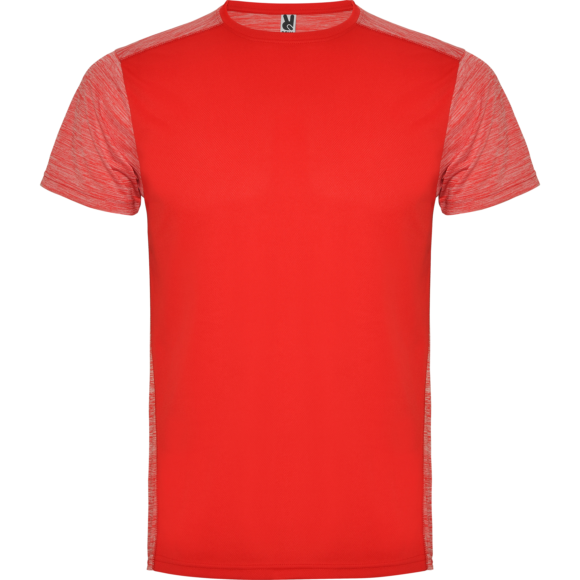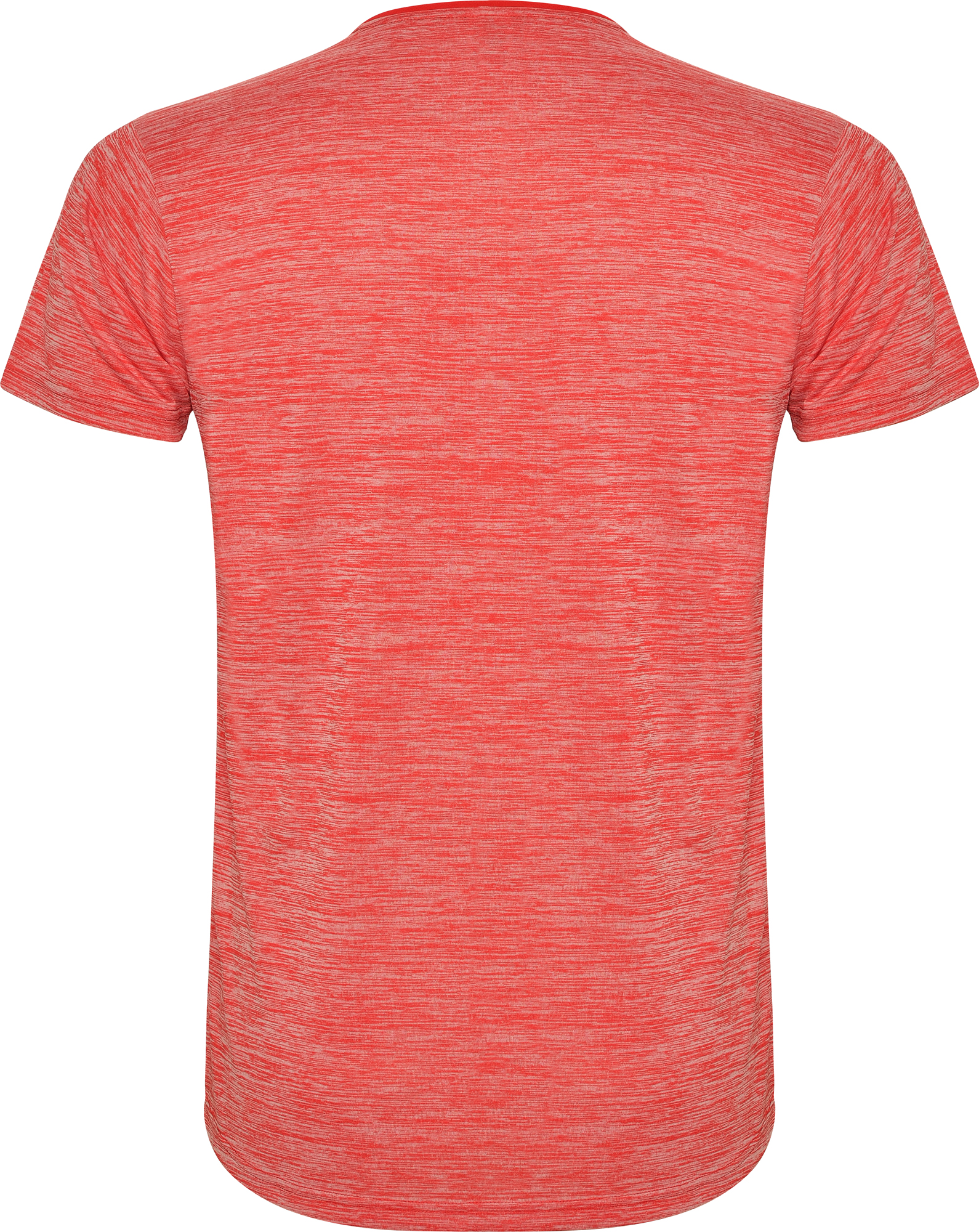 Camiseta técnica de manga corta con cuello redondo. Combinada en espalda, hombros y mangas con dos tejidos de poliéster. Tejido principal frontal bird´s eye y tejido space dye en la parte trasera. Patronaje en la espalda ligeramente mas largo.